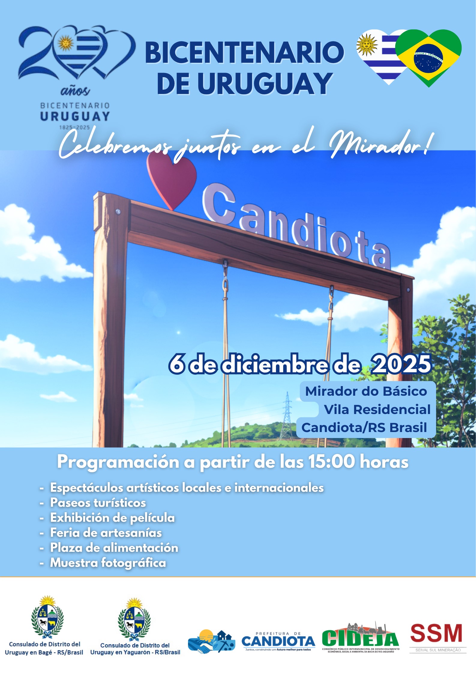 Los Consulados de la República Oriental del Uruguay en Bagé y Yaguarón, en conjunto con la Prefeitura de Candiota y el Consórcio de Municípios do CIDEJA, invitan a toda la comunidad a participar de una gran jornada de integración cultural y confraternización binacional en el marco del Bicentenario de la Independencia del Uruguay.