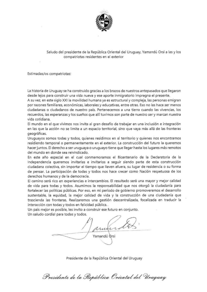 Esta saudação, dirigida especialmente aos nossos compatriotas no exterior, reflete o compromisso do Governo Nacional com os uruguaios e uruguaias que, mesmo distantes da pátria, mantêm vivas as nossas tradições, valores e o sentimento de pertencimento à nação.