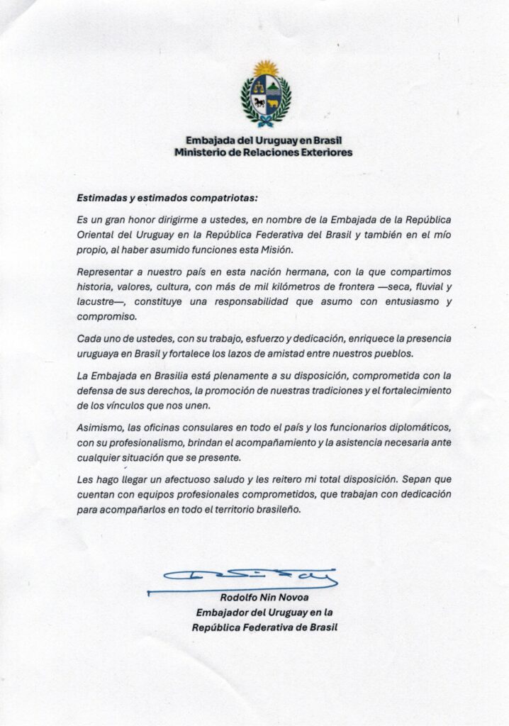 Mensagem do Embaixador do Uruguai no Brasil à comunidade uruguaia residente