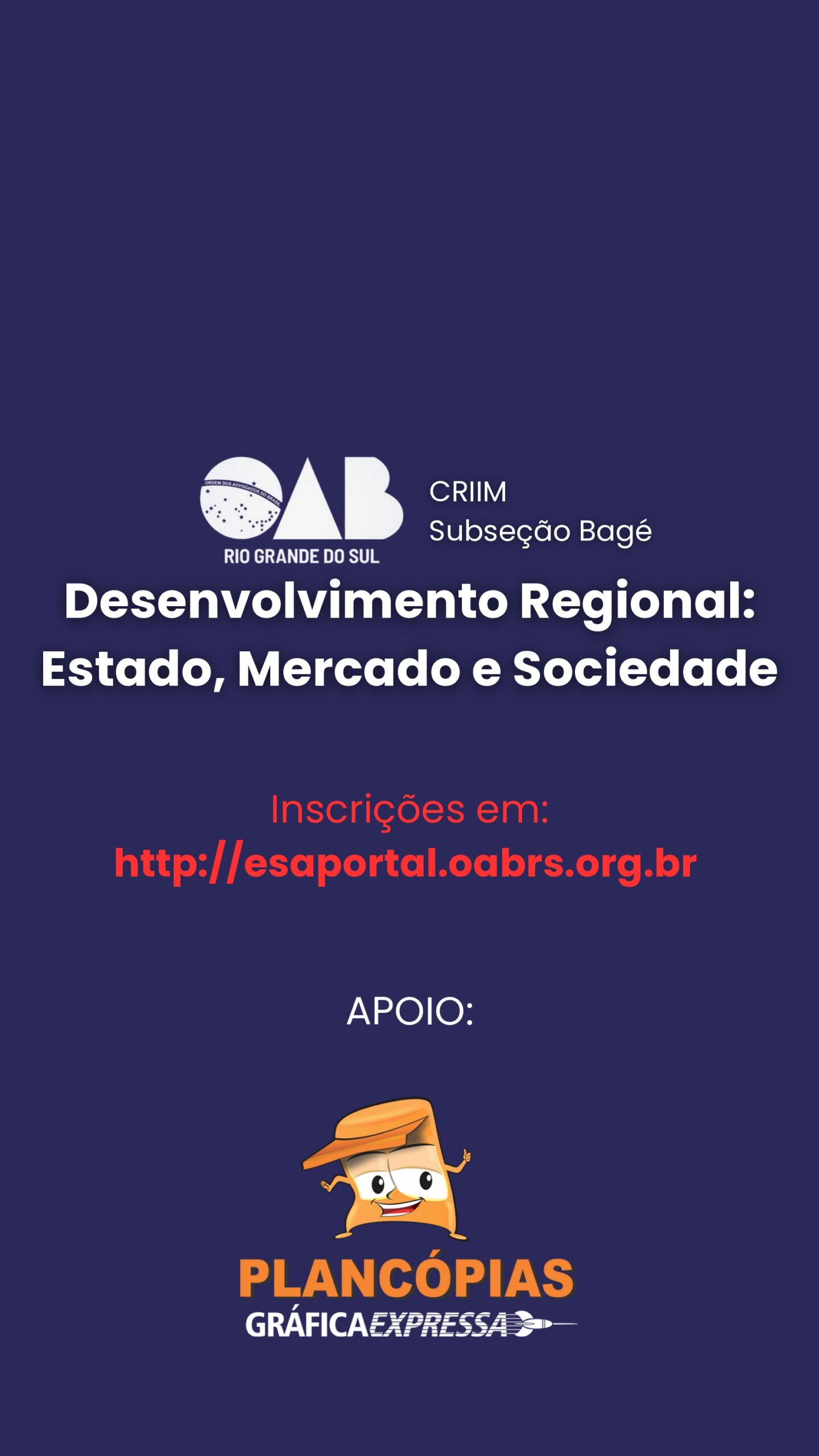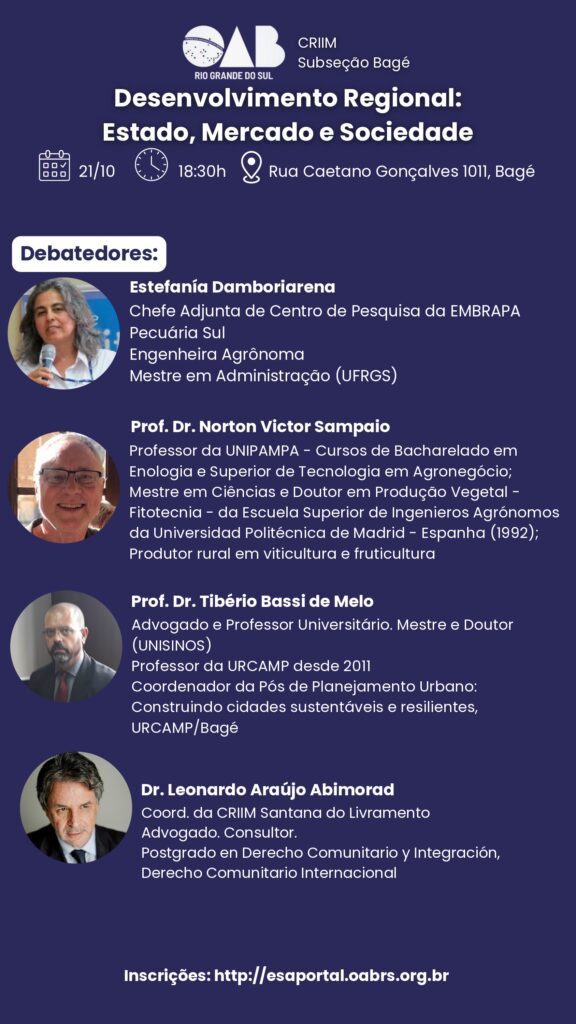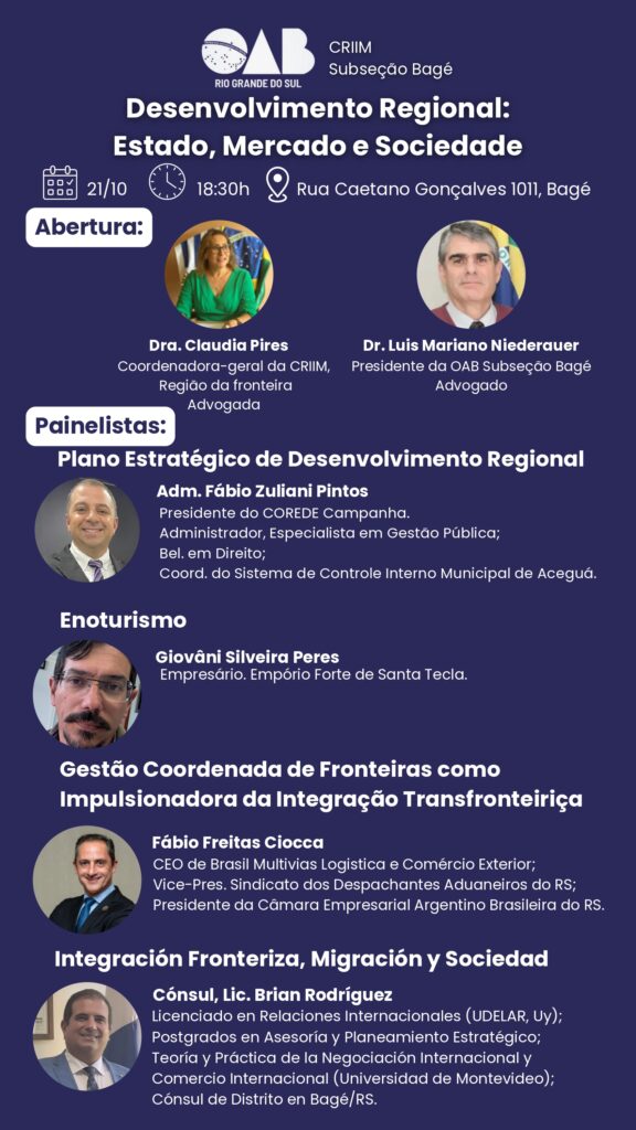 O Sr. Cônsul, Lic. Brian Oscar Rodríguez Cancela, participará como palestrante no evento “Desenvolvimento Regional: Estado, Mercado e Sociedade”, organizado pela Ordem dos Advogados do Brasil (OAB) – Subseção Bagé, a realizar-se no dia 21 de outubro, às 18h30, na sede da OAB Bagé, localizada na Rua Caetano Gonçalves, 1011.