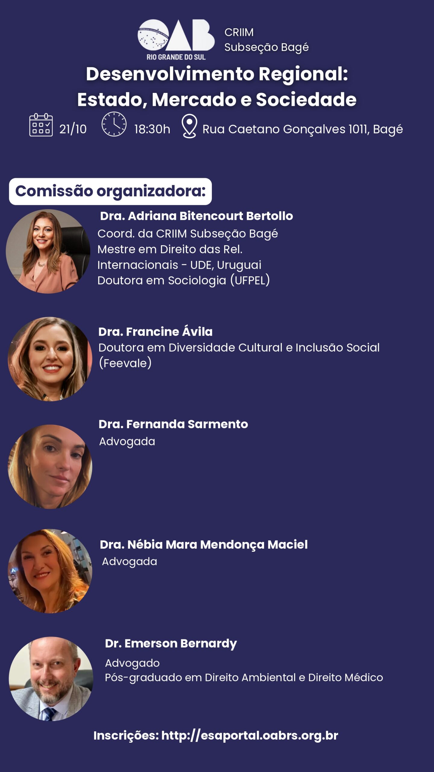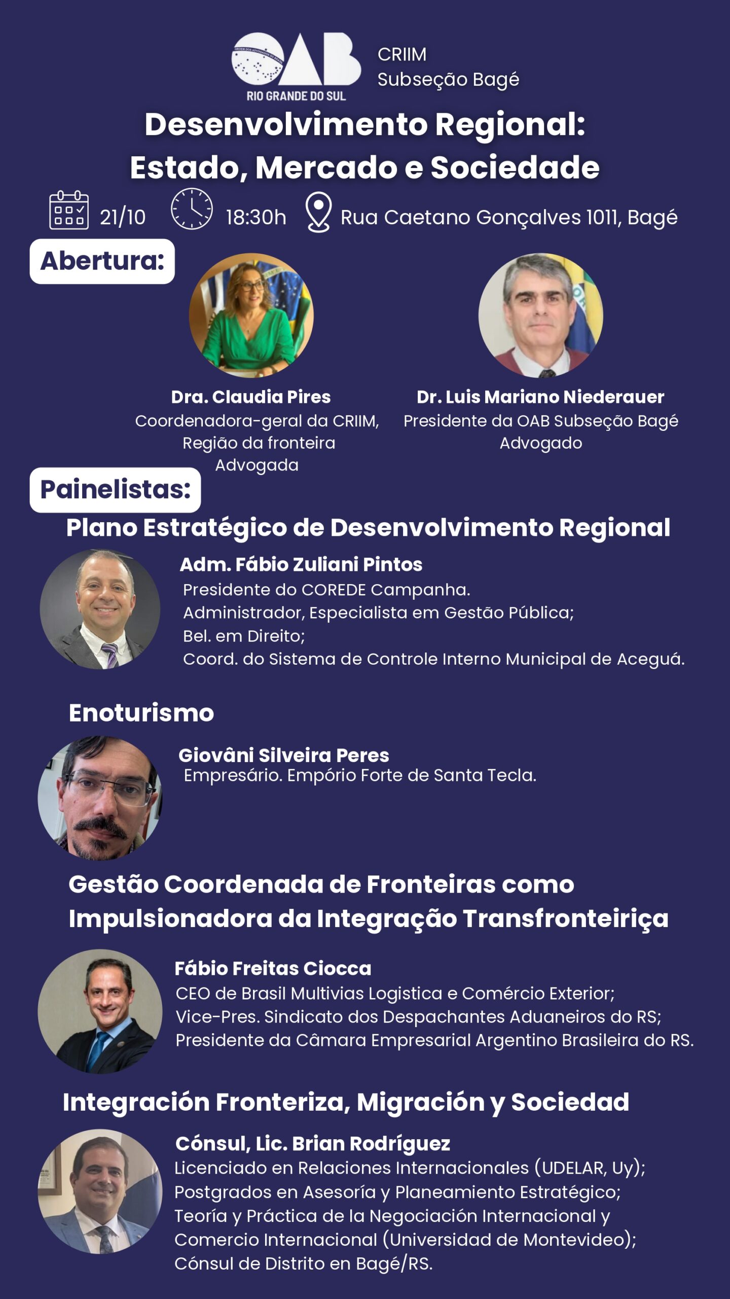 O encontro contará com a participação de renomados profissionais, acadêmicos e representantes de diversos setores, no âmbito de uma jornada dedicada à reflexão sobre os desafios e oportunidades do desenvolvimento regional, promovida pela Comissão Regional de Integração e Intercâmbio de Migrações (CRIIM) da OAB Bagé.