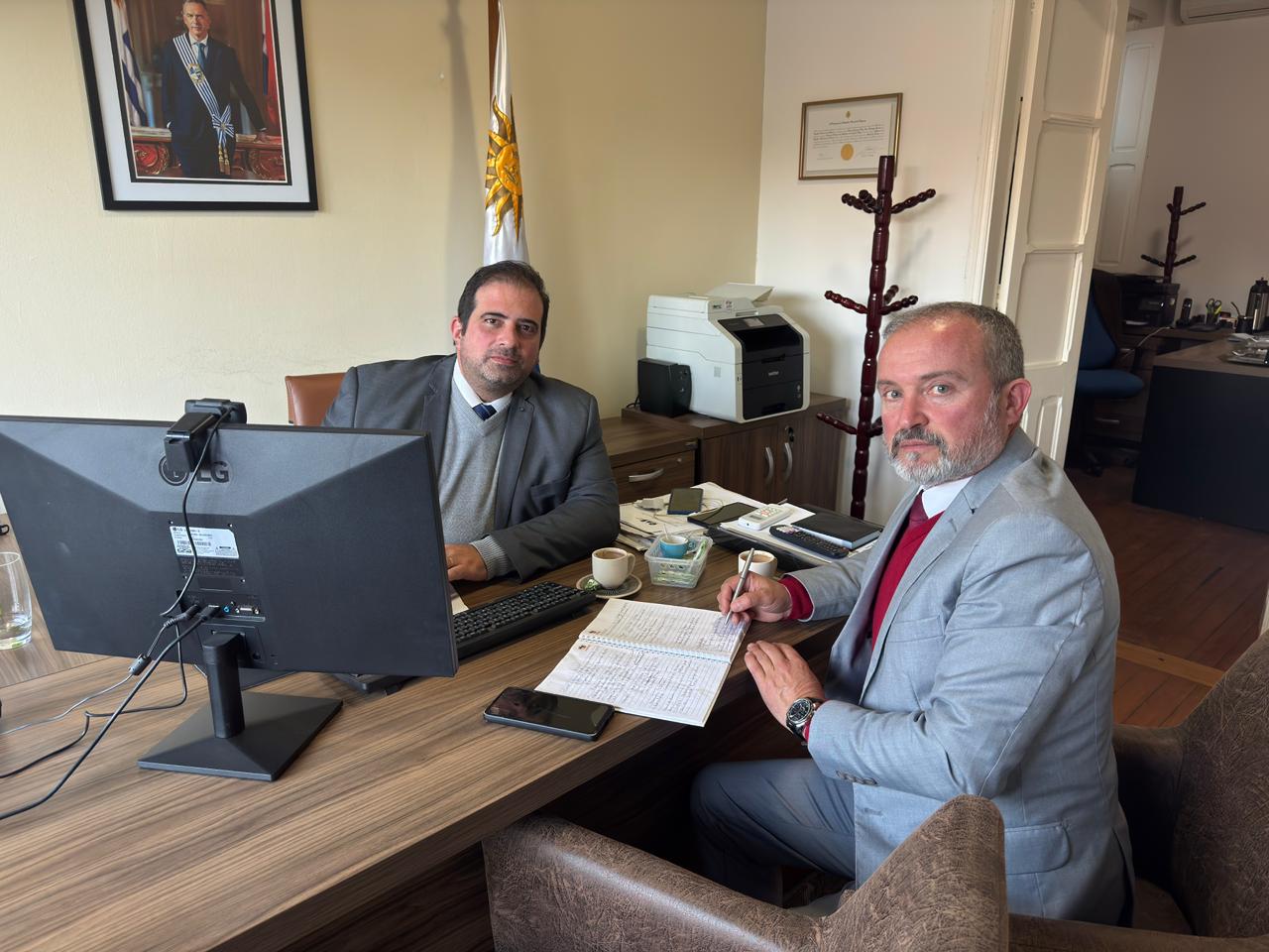 Na tarde do dia 13 de junho, o Cônsul do Uruguai em Bagé, Lic. Brian Rodríguez, reuniu-se no Consulado com o Inspetor-Chefe da Receita Federal de Bagé, Sr. Glaucio Nascimento de Abreu, para tratar de assuntos relacionados à situação da Área de Controle Integrado (ACI) em Aceguá, Brasil.